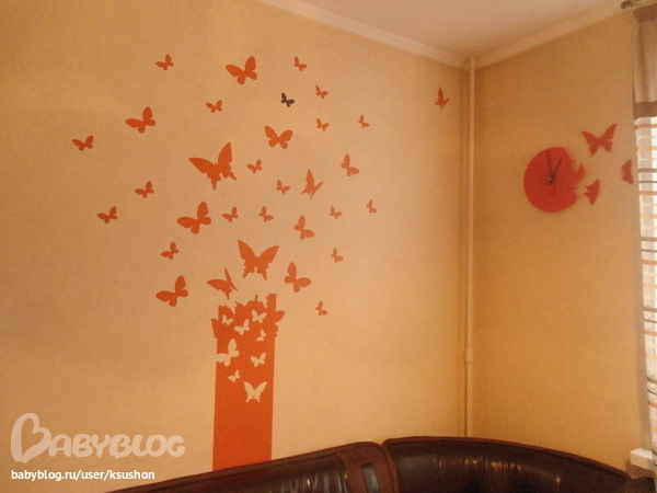 Не знаю, поможет кому мой хваст или нет, комната не широкая, более мелкий план взять не получилось. Это надо изголовьем кровати, между бабочками скоро повесятся фотки, смотрется будет шикарно :)