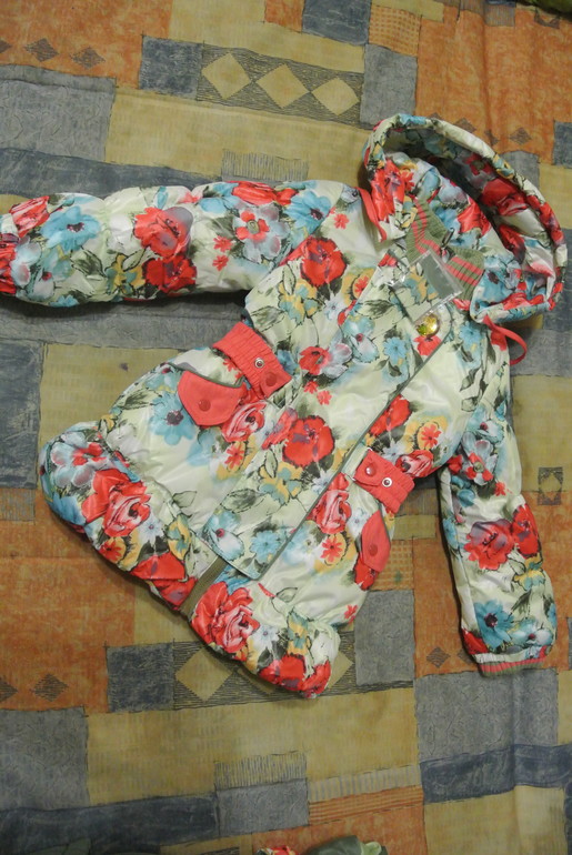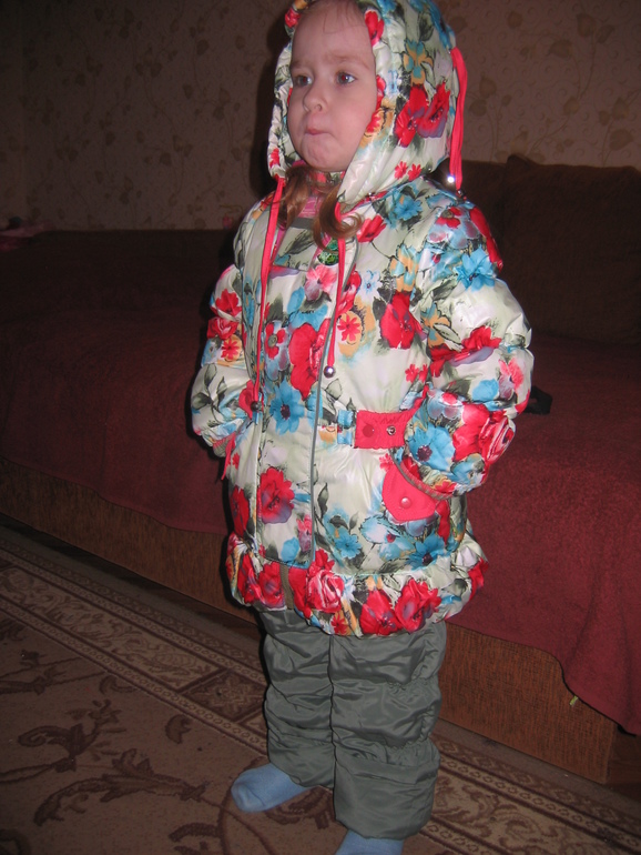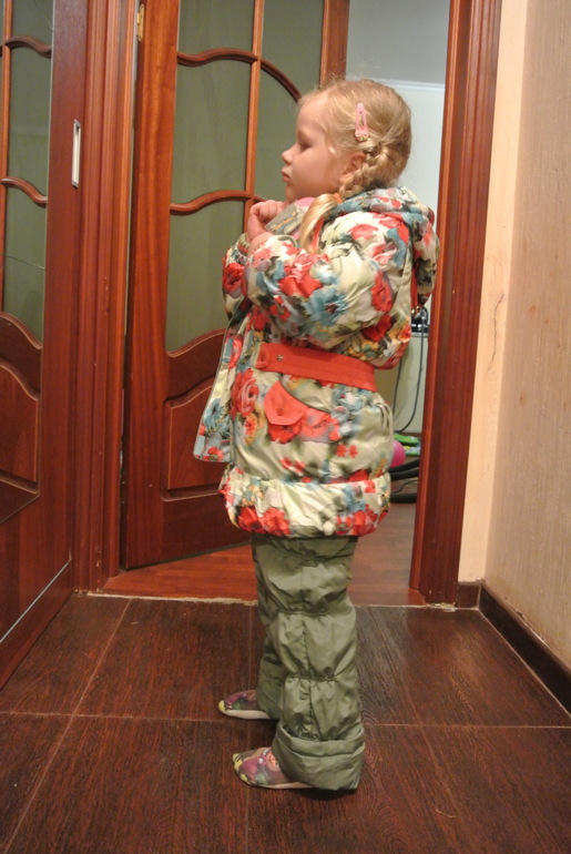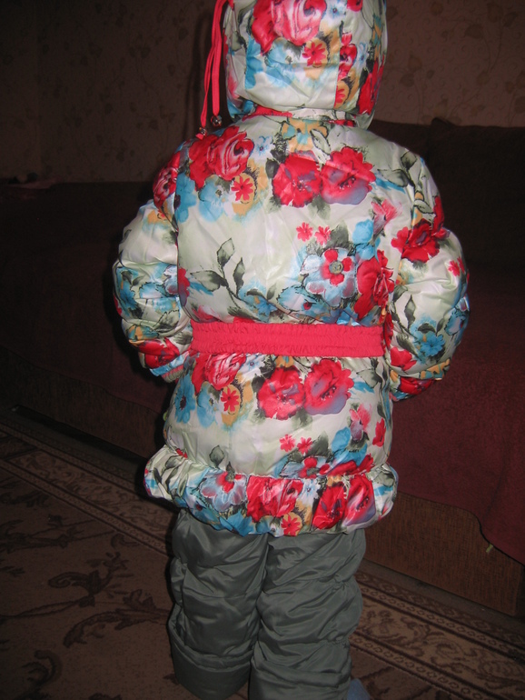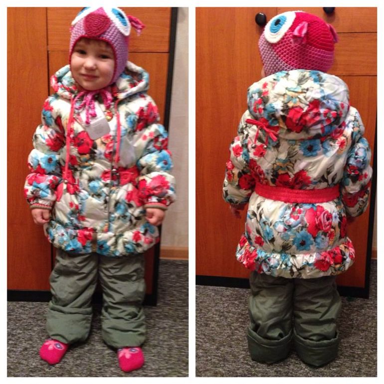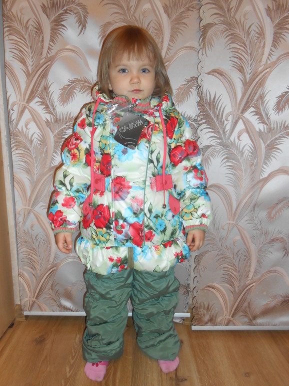 На фото дочка подруги. (с ее разрешения). Моя не захотела мерить весь комплект, только куртку, с ее ростом 90 см, 98-как раз на весну-осень хватит..