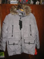 Очень хороший пух, мех енот, много карманов, цвет серый