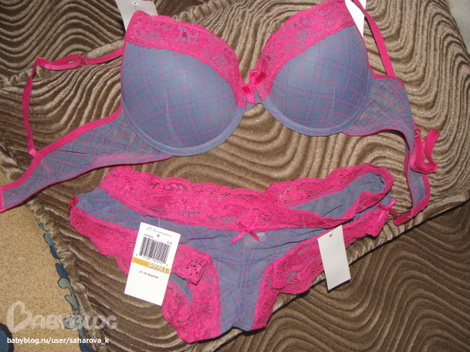 Очень красивый и яркий комплект! Обаладенный. Размер бюста соответствует нашему 70Б, трусики размер S - на бедра до 92см думаю. Бюст без пуш-апа, тонкий поролон. Вообще сидит классно, не давит, не тянет, оч приятный к телу. Мне не подошло расстояние между чашечками. 700р.