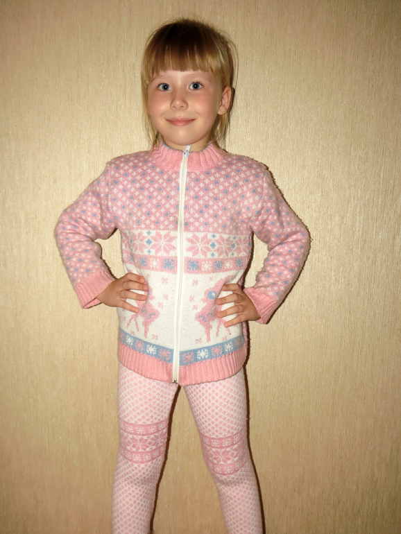 Вот наш свитерок, р-р 122 на рост 118. Рукавчик немного великоват — подвернули.