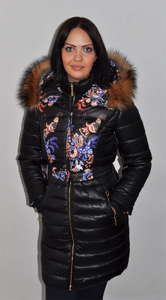 Пуховик с капюшоном. Отделка мех енота. Капюшон и мех съемный. Длина изделия по спинке 112см.