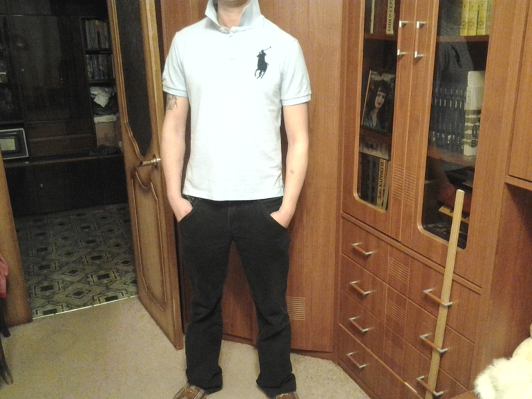 Извините за задержку, сейчас сделала замеры Ральфа:длина плеча 14,5, ПОГ 53, длина футболки 64.При этом ОГ98.Конечно она свободна ему,размер М. Если муж любит в обтяг надо S я думаю, а М свободна.Лакост позже напишу.