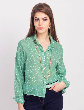 Описание: Полотно тонкого саржевого переплетения с мягким атласным блеском. Уголки воротника украшены металлическими деталями, пуговицы в виде пирамидок - все золотистого цвета. Силуэт прямой, классический рубашечный, со скругленной линией низа переда и спинки.