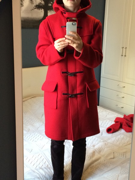Могу сказать, что я наверняка влезла бы и в размер 32, но рисковать было страшно. Пальто не имеет ярко выраженной талии и сидит мешковато, но я так понимаю для классического дафлкота это норма. Ношу его на толстую флисовую кофту. На фото я в ней, она тоже красная и у неё высокий воротник, выглядит как будто одно целое ))) но это не так. На последнем фото я кофту сняла и закрыла горло хлястиком, который пристегивается под капюшоном. По качеству нет нареканий, толстое сукно, довольно тяжелое, ветром практически не продуваемое, что очень меня удивило и обрадовало.![]()