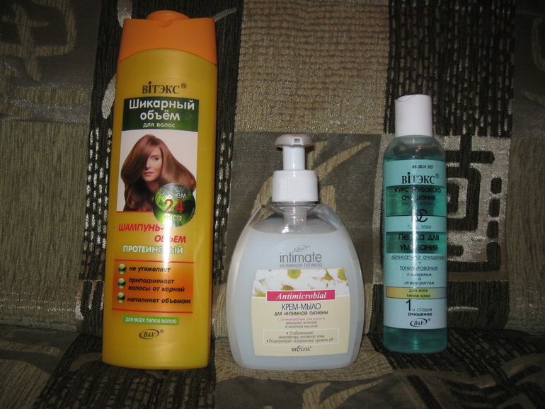Шампунь понравился, волосы действительно пышные! Пенка для умывания особого восторга не вызвала, но неплохая, мыло для интимной гигиены тоже неплохое.