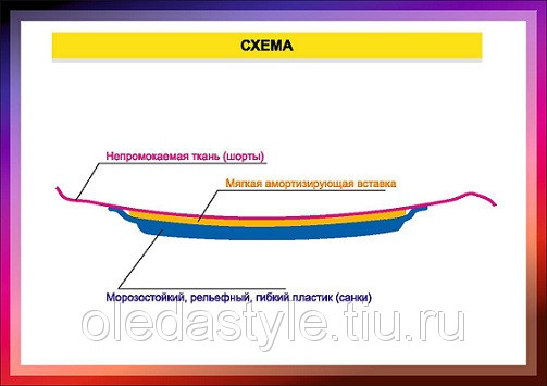 -Между тканью и пластиковой ледянкой проложена амортизирующая прокладка. При скатывании с горок в санках шортах, ребёнок не чувствует неровностей, различных выступов и углублений на горке, тем самым процесс катания у него всегда сопряжен с комфортом и радостью происходящего.