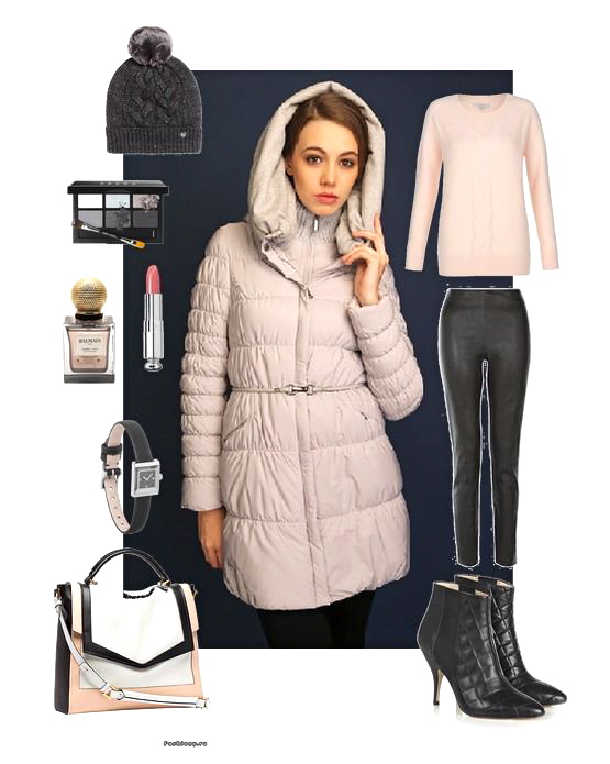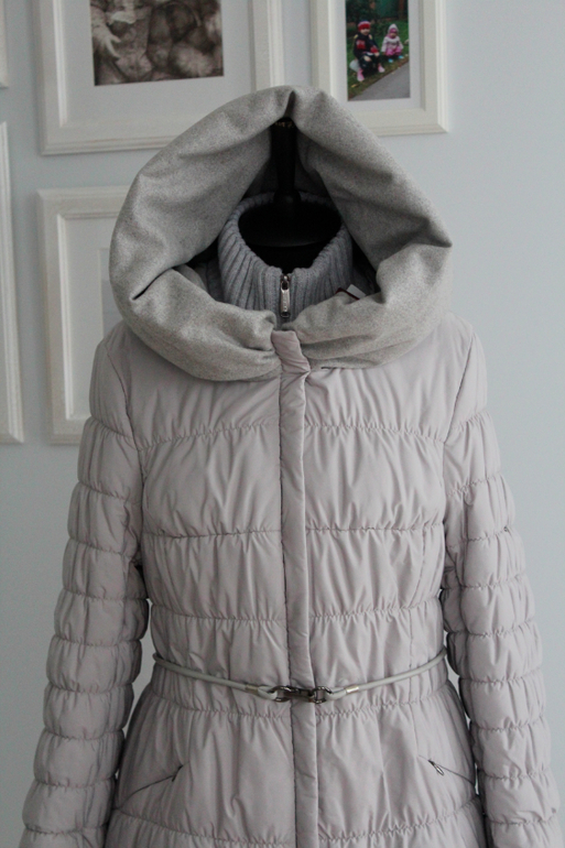Цвет жемчуг. Очень стильная, продуманная, оригинальная, с интересными деталями, Оригинальный капюшон превращается в теплый и уютный воротник. Изнутри капюшон из шерстяной ткани, снаружи - плащевка. Капюшон застегивается спереди на 2 кнопки. Вязаная горловина очень мягкая и толстая.