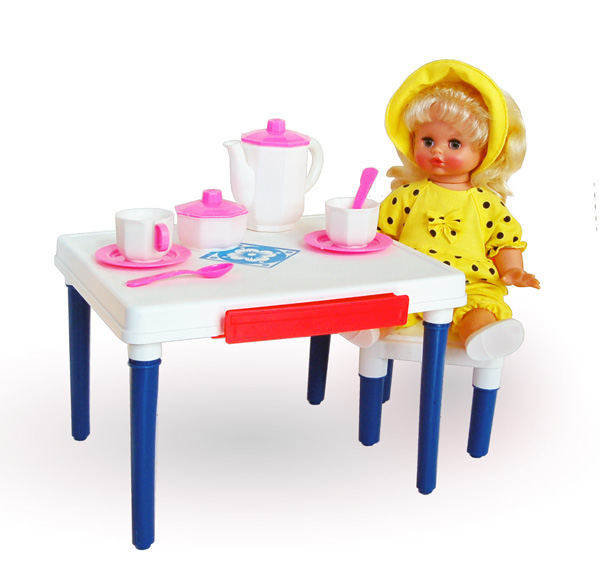 Мебель "Малыш". В комплект входит один стул и столик. Размеры стола 29*34 см, высота 24 см, высота сидения стула 13 см, высота вместе со спинкой 27 см.