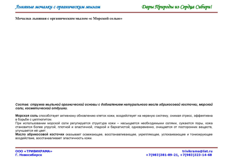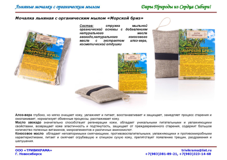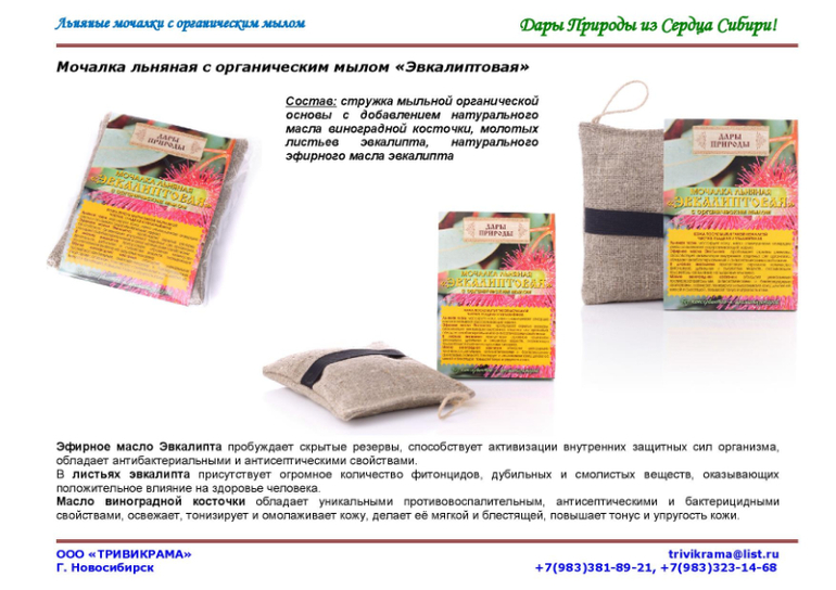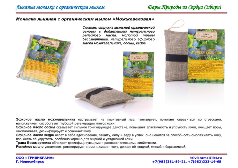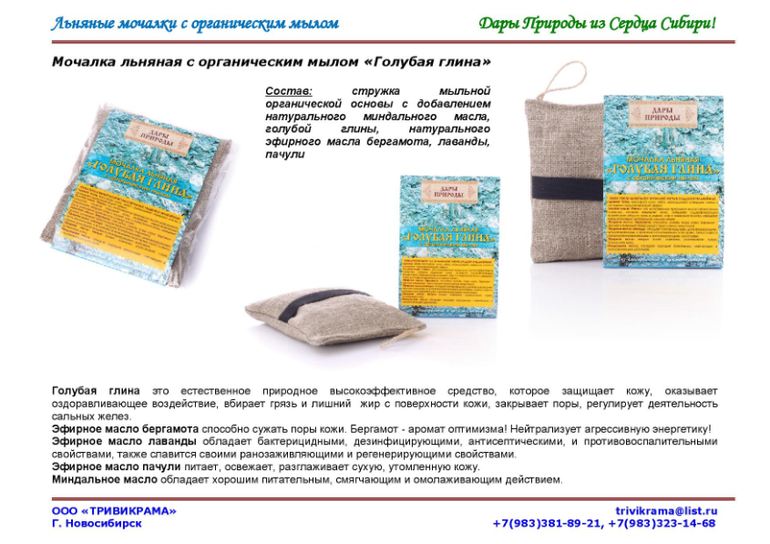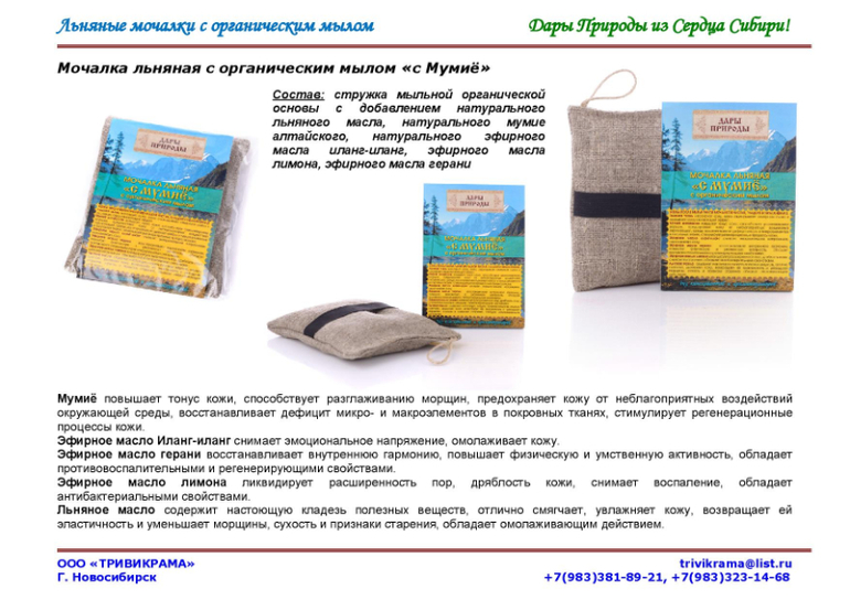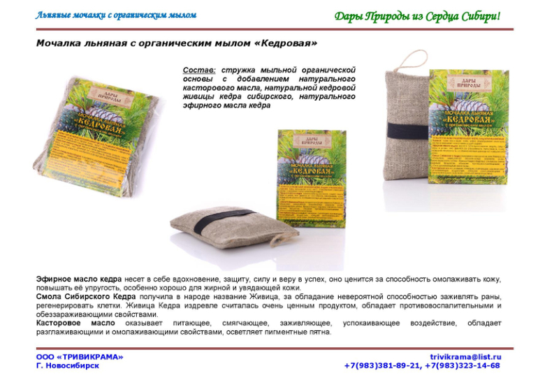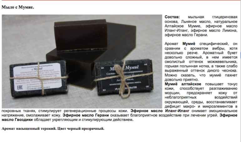 Натуральные мумиё, мёд, глина, кофе, кедровая живица, какао тёртое, травы помогают сохранить и продлить молодость кожи, делают её подтянутой, успешно справляются с такими проблемами как излишняя жирность, воспаления и угри, шелушение, расширенные сосуды, целлюлит, растяжки и другими косметическими дефектами.
