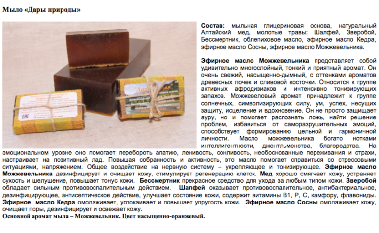 Мыльная глицериновая основа, натуральный Алтайский мед, молотые травы: Шалфей, Зверобой, Бессмертник, облепиховое масло, эфирное масло Кедра, эфирное масло Сосны, эфирное масло Можжевельника. Эфирное масло Можжевельника представляет собой удивительно многослойный, тонкий и приятный аромат. Он очень свежий, насыщенно-дымный, с оттенками ароматов древесных почек и сливовой косточки. Относится к группе активных афродизиаков и интенсивно тонизирующих запахов. Мед хорошо смягчает кожу, устраняет сухость и шелушение, повышает тонус кожи. Бессмертник прекрасное средство для ухода за любым типом кожи. Зверобой обладает сильным противовоспалительным действием. Шалфей оказывает противовоспалительное, антибактериальное, дезинфицирующее, антисептическое действие, улучшает состояние кожи, содержит витамины В1, Р, С, камфору, флавониды. Эфирное масло Кедра омолаживает, успокаивает и повышает упругость кожи. Эфирное масло Сосны омолаживает кожу, очищает поры, дезинфицирует и освежает кожу.