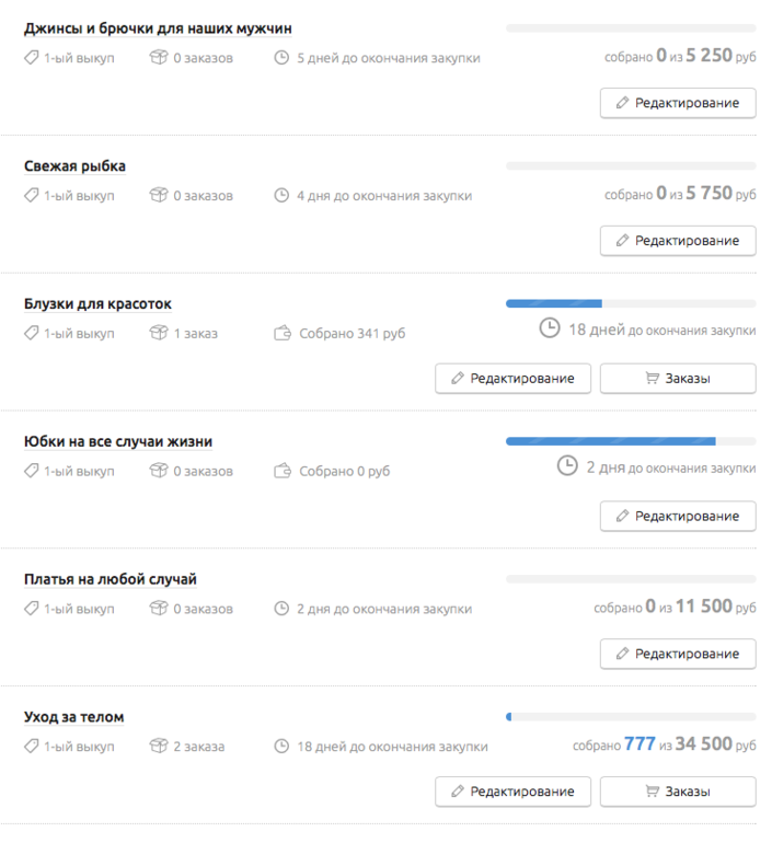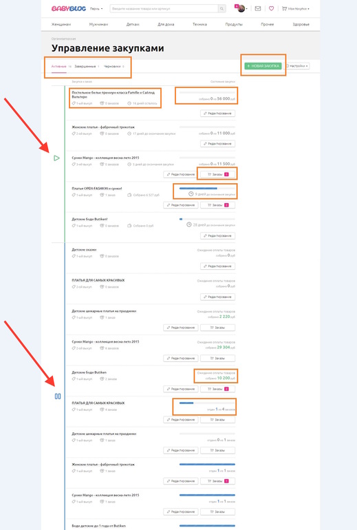Стрелочками показаны активные закупки(зеленые) и закупки на стопе (синие)