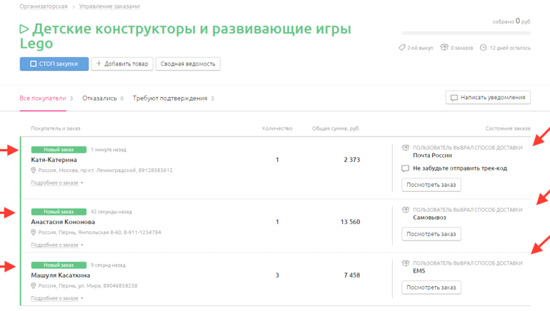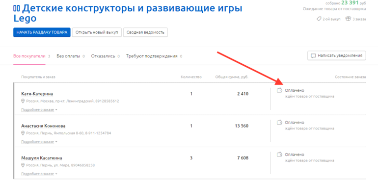 Все заказы оплачены,ожидаем доставку до организатора.