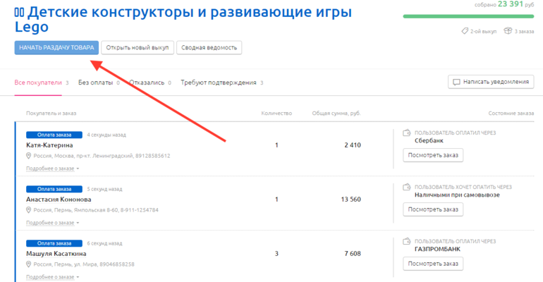 Как только организатор получил товар,он начинает раздачу.