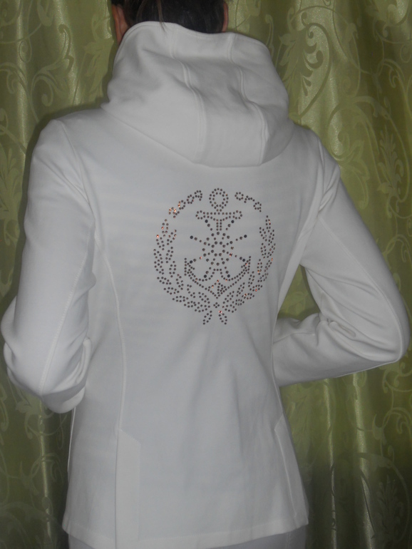 Арт..300312 Пиджак,ткань плотный хлопок,с капюшоном,на спине аппликация в виде якоря из страз,Ткань-хлопок 100%,Цвет белый,Размер: М на 46,Цена -2295руб. с орг. ОТДАМ ВМЕСТЕ С ПОЧТОВЫМИ ЗА 2000р МОЁ живое фото 2-летней давности. Идёт на 46 рос,тянется.Я С РЕГИОНА-ТОЛЬКО ПОЧТА!!!