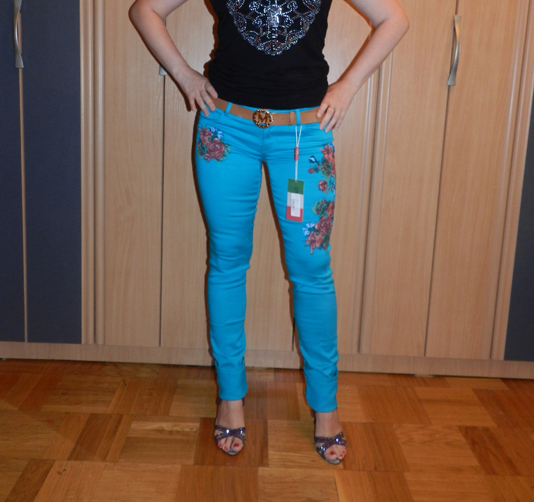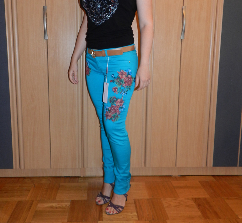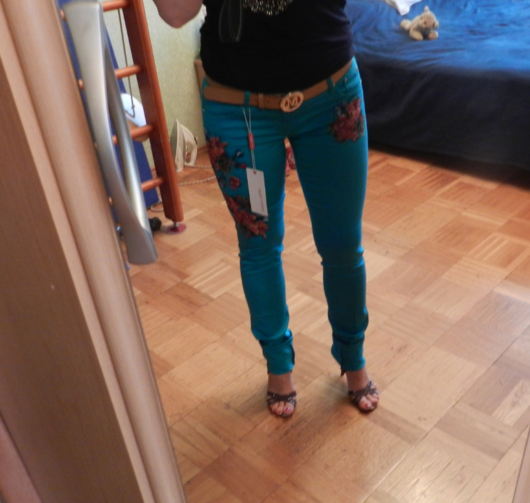Брючки плотные стрейчевые, очень хорошо тянутся. Размер 30. Цветы на брюках вышиты. Ремень в комплекте.