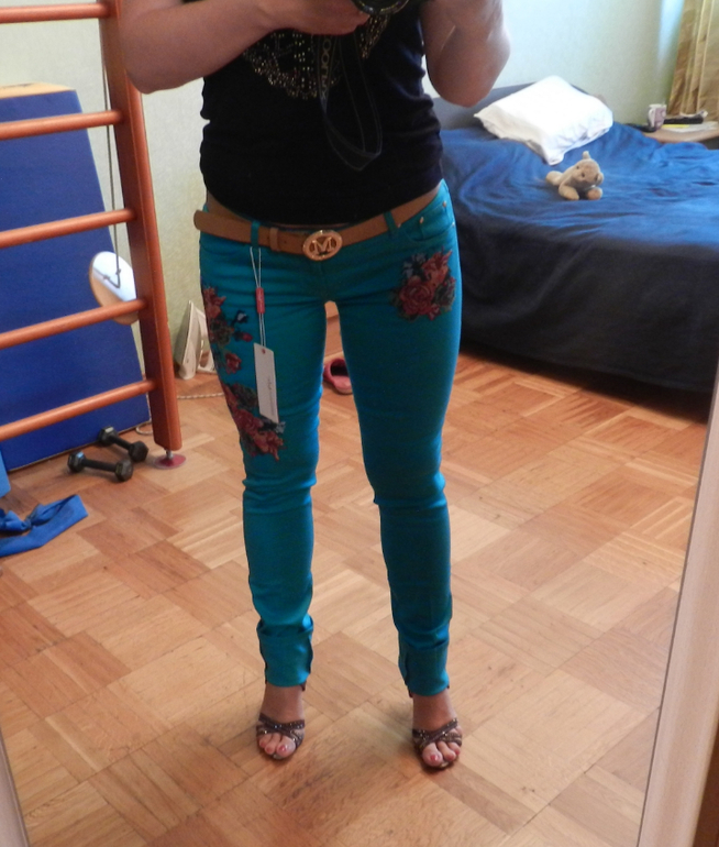 И вот как они смотрятся на мне) маловаты конечно, поэтому пристраиваю)) И еще длинные пришлось их подвернуть для фото на 10-12 см. (у меня рост 163)))