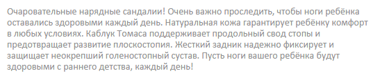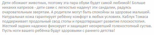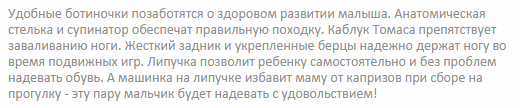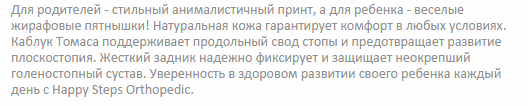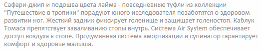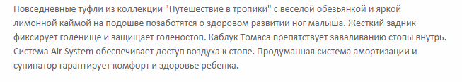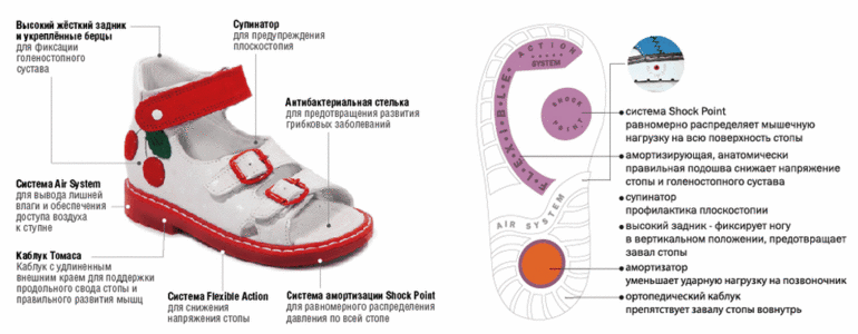 Укрепленные берцы и высокий жесткий задник позволяют надежно зафиксировать голеностоп в процессе бега и ходьбы. Каблук Томаса своей особой удлиненной формой края обеспечивает правильное развитие мышц и уменьшает нагрузку на продольный свод стопы, не давая ноге заваливаться внутрь. Супинатор предотвращает развитие плоскостопия, а передняя часть подошвы каждой модели снабжена специальной системой амортизации Shock Point. Она позволяет равномерно распределять давление по всей стопе, снижая нагрузку на позвоночник.