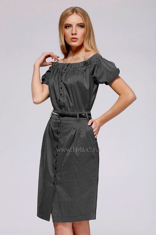 Пристрою приталенное платье известного белорусского дизайнера женской одежды Л. Балуновой, длиной до колена, отрезное по линии талии. Лиф с широким вырезом горловины, открывающим плечи, по верху кулиса с эластичной лентой. Застежка спереди до низа на пуговицы. Рукав-реглан длиной выше локтя. Юбка-карандаш зауженная к низу с карманами в швах. По талии втачной пояс со шлевками. Кожаный ремешок.