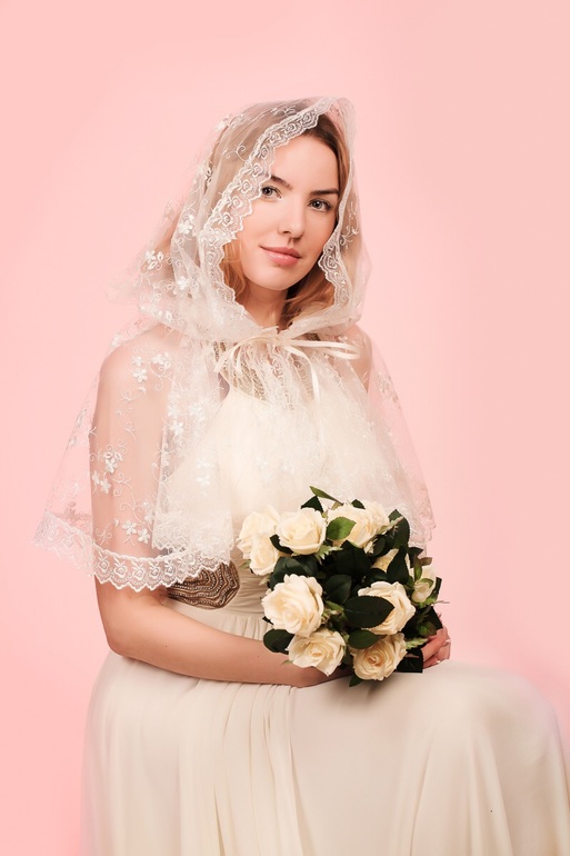 Мелкий растительный рисунок, мягко контрастирующий с прозрачным фоном, и изящные полукруглые фестоны вокруг лица помогают создать спокойный и скромный образ.