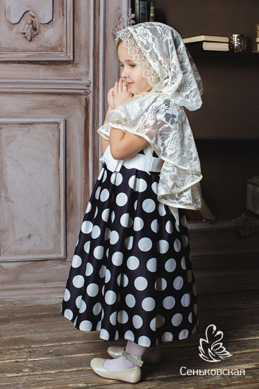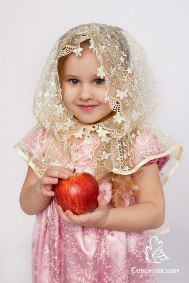 Сказочный платок не оставит равнодушной ни одну юную красавицу. Можете быть уверены, в таком нарядном платке Ваше чадо будет с удовольствием посещать храм. Нежный цветочный узор на ажурной сетке, благородный молочный цвет и изысканное кружево, обрамляющее лицо, создают очаровательный и необычайно красивый образ. Косая бейка в тон подчеркивает воздушность платка, а пуговица-кристалл Swarovski делает его нарядным и изысканным.