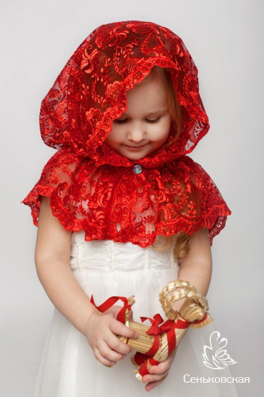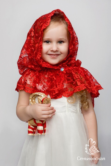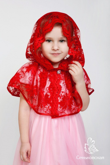Насыщенный красный цвет, двойные фестоны, мягко обрамляющие лицо, великолепный по своей красоте и сложности узор, подчеркнутый бейкой в тон и прозрачным фоном, роскошная застежка в виде пуговицы Swarovski - все говорит о том, что перед нами юная королева.