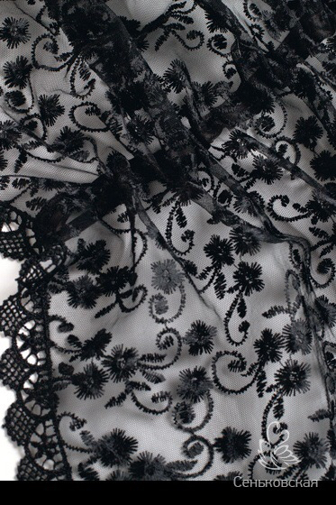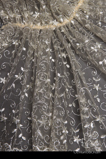 Отделка: каймовая ткань выкроена таким образом, что обработанный край расположен около лица. Остальные стороны изделия обработаны кружевом, (5 см) вышивка на сетке в цвет основной ткани.