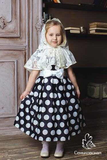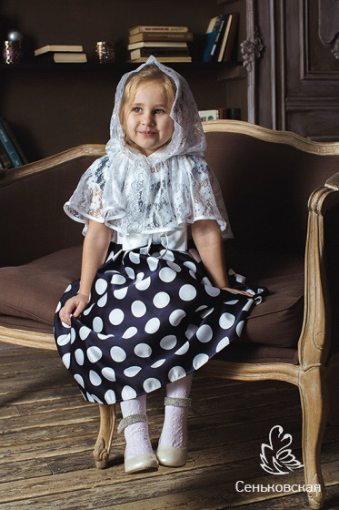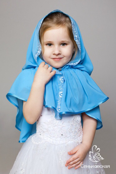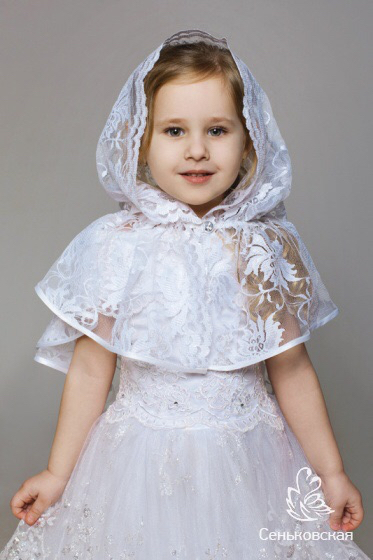В платке, украшенном изящным кружевом в виде нежных цветов и застегивающемся на яркую пуговицу Swarovski, каждая девочка почувствует себя феей.