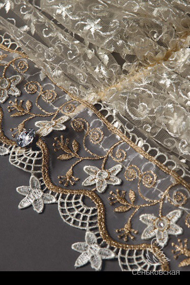 Отделка: кружево, вышивка на сетке золотой нитью, с кристаллами Swarovski. Остальные стороны изделия обработаны косой бейкой в цвет основной ткани, пуговица кристалл Swarovski.