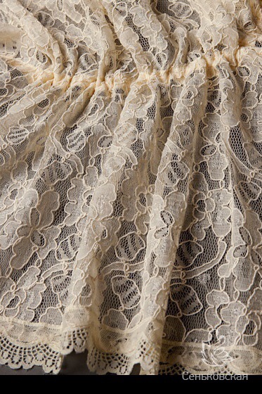 Отделка: кружево (5 см) вышивка на сетке шелковой нитью молочного цвета. Остальные стороны изделия обработаны косой бейкой в цвет основной ткани. На пуговице.