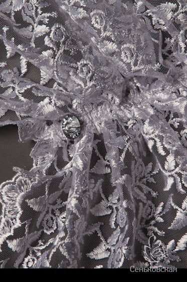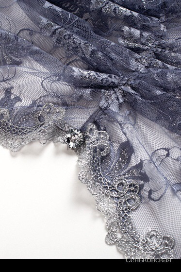 Отделка: кружево (2 см) вышивка на сетке серебрянной нитью со всей стороны изделия, пуговица кристалл Swarovski.