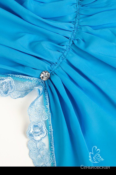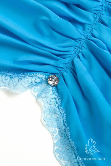 Модель выполнена в нежно-голубом цвете, украшена яркой пуговицей Swarovski и великолепным кружевом в виде изумительных по своей красоте цветов.