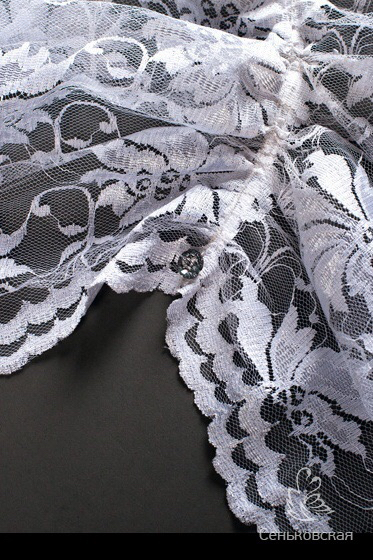 Платок украшен со всех сторон кружевом, которое выглядят торжественно и стильно.