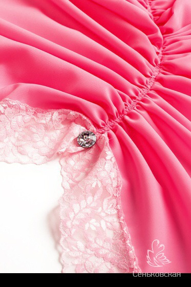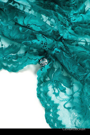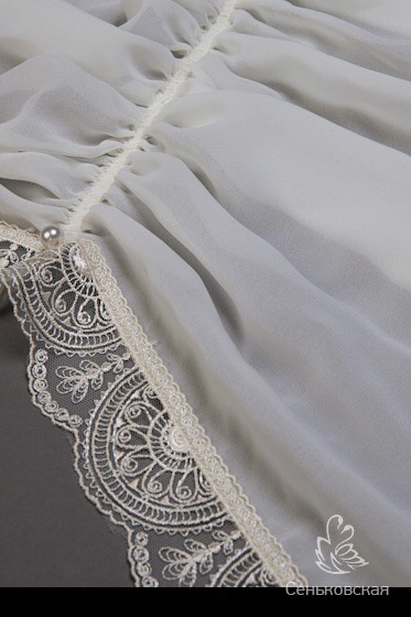 Отделка: кружево (5 см) вышивка на сетке шелковой нитью. Остальные стороны изделия обработаны косой бейкой в цвет основной ткани, пуговица кристалл Swarovski.