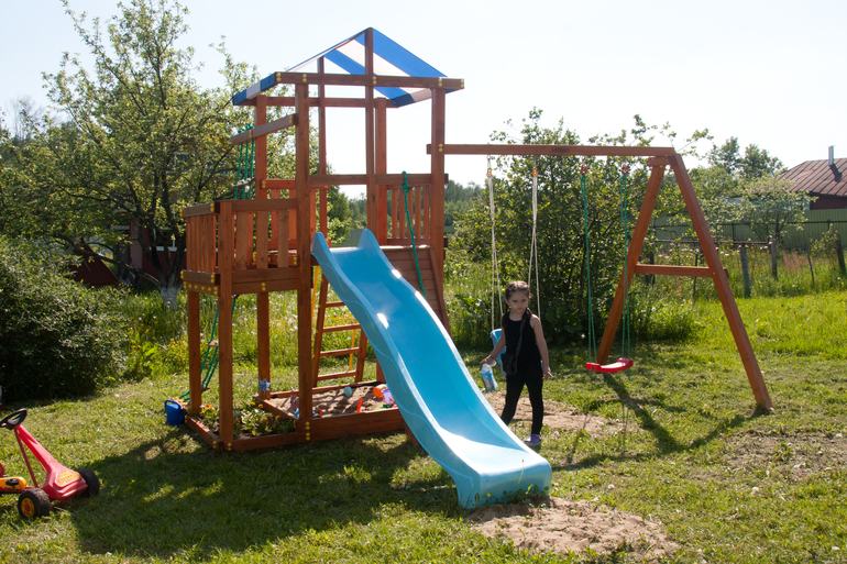 из минусов: был пересорт по деталькам.....не было доски под крышу положили лишнюю доску на пол балкончика.....и качели....ну откровенно короткие веревки для качелей.....но леруа мерлен нам в помощь и веревки мы купили лучше, прочнее и симпатичнее))))))