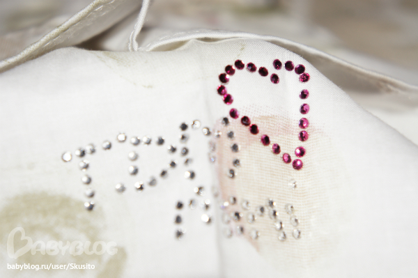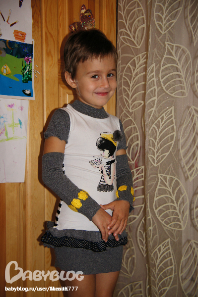 Плотненький трикотаж кофточки, на плечике 2 кнопочки. Стразики красные на бантике и ботиночках у девочки. Юбочка сделана небольшим баллончиком на подкладочке, сверху материал как слегка жатый.