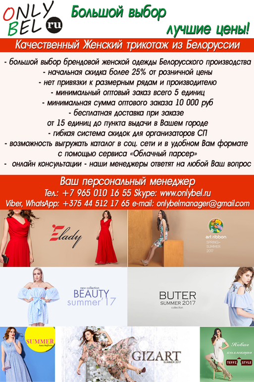 OnlyBel в Совместные покупки 9 лет OnlyBel - качественный женский трикотаж из Белоруссии! Предложения от Поставщиков. Передача закупок организаторами. Onlybel.ru приглашает к сотрудничеству Организаторов СП Посмотрите еще 20 записей на эту тему Отменить Ответить Эксклюзивные женские сумки с вышивкой из натурального материала - 100% льна Интернет магазин бижутерии www.ForMyGirl.ru - предложение для СП Чаты Беременных Выберите чат: Январята-2026 Февралята-2026 Мартята-2026 Апрелята-2026 Майчата-2026 Июнята-2026 Июлята-2026 Августята-2026