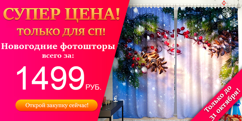 - Гарантированные подарки всем организаторам СП: от фотоскатертей до фотоштор на кухню или фотоштор в гостиную, спальню и детскую комнату;