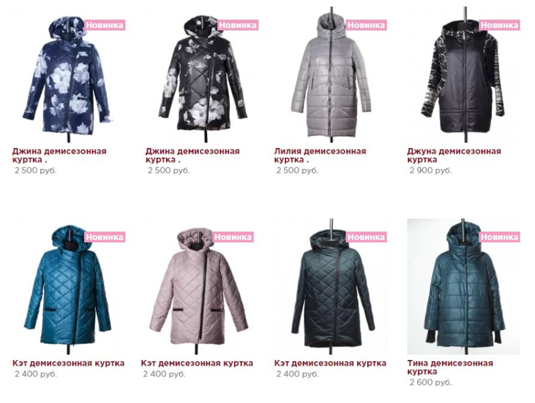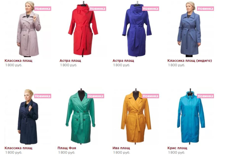 Диапазон размеров также довольно разнообразен - от 42 до 62 - что позволяет нам удовлетворить запросы практически всех покупательниц. Также предлагается большой выбор материала: терракот, твид, плащевка и жаккард.