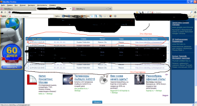 Вот скрин айпи адресов пользователей. КОММЕНТАРИИ ВОТ СЮДА ПОЖАЛУЙСТА http://www.babyblog.ru/user/lenta/Irinaarina