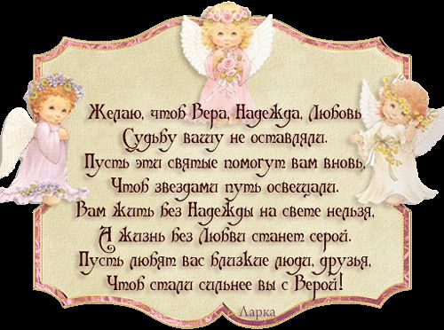 Надежда, Вера и ЛюбовьТри дочки матушки СофииОпять волнуют в жилах кровь,Чтоб мы душою не остыли.Поддержка вы, опора, мощьНаграда немощным и сильнымСебя должны мы превозмочь,Чтоб сердце сделать для любви обильным.Пусть во вселенной воцарится мирСемьи священной славное дареньеИ будет царствие, и пир,И вечное души стремленье!Поздравляем Вас София и Надежда