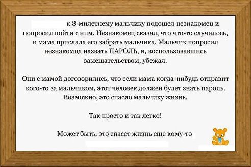 Я своему сыну запрещаю разговаривать с незнакомыми людьми. Мальчик симпатичный и многие лезут к нему с разговора ми особенно в общественном транспорте бабки и нетрезвые мужики. Он на вопрос как зовут молчит а я объясняю что это я ему не разрешат вступать в разговоры. И я столько негатива получаю в свою сторону!!! А в пятницу мы ехали с занятий так автобус аж разделился на два лагеря- за меня и против:)) Но мне все равно! Я по прежнему не разрешаю разговаривать с незнакомыми, а вот по поводу пароля- хорошая идея!Домашние детки очень доверчивы и не видят плохого. Они просто не знают что кто то может обидеть- в семье они с этим не сталкивались!Хуже дела с подростками- моя дочь живет по принципу- все умрут а я останусь/ название фильма/, страха нет и считает себя взрослой:( и это меня пугает. Стараюсь разговаривать, но толку нет. Правда сейчас у нее парень и они много времени проводят вместе, и мне немного спокойнее- я точно знаю что ее проводят до дома