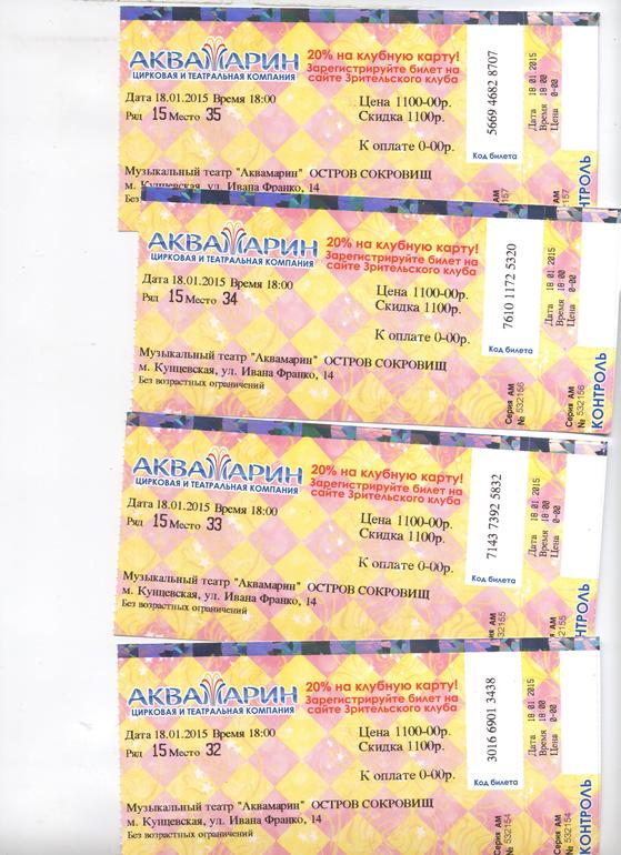 Благодарности и поздравленияДД, хочу поделиться радостью! Вчера получила билетики на мюзикл "Остров сокровищ". В этом мне помогла Лена. Я прошла все регистрации, получила баллы на эл. карту, съездила на ул. Мельникова дом 7 и получила билеты. И всё это БЕСПЛАТНО. Большое спасибо. Лене. Моя внучка выбирает подружек, с которыми поедет. Здорово.