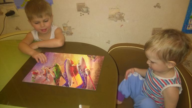 И пока наше тесто, следуя рецепту, отправилось полежать в холодильник. Мы сели собирать пазл, который тоже получили от нашей феечки. И даже Димка правильно сложил несколько кусочков