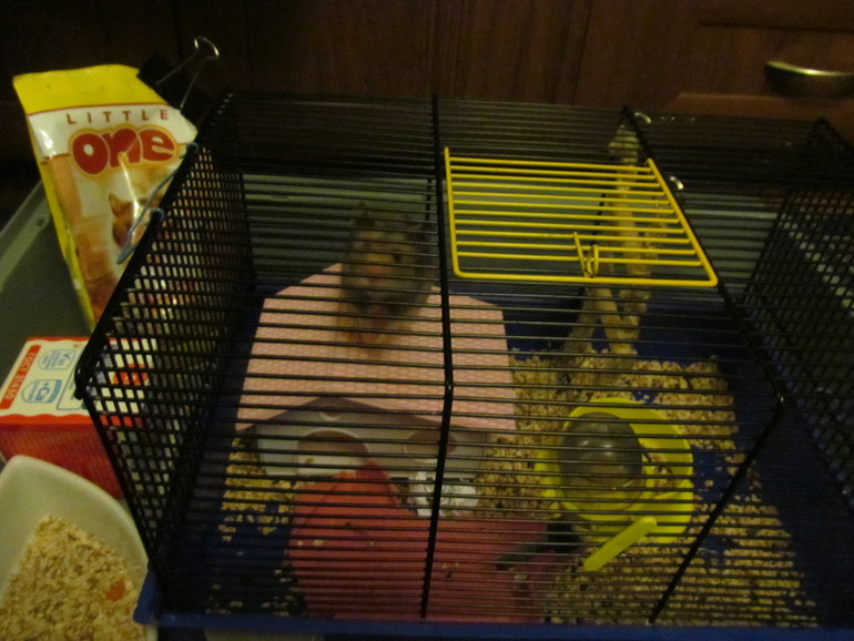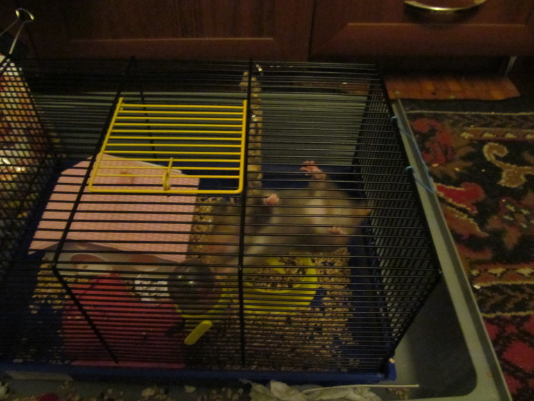 Женечка, добрый вечер! Я только сейчас сообразила, что фотоотчет не прислала. Вот клеточка. Мы правда красную лесенку убрали, т.к. наша Розочка заднюю лапку заднюю повредила, и мы убрали дополнительный уровень, чтобы она акробатические приемы не применяла. )) А она все-равно мартышка у нас. Правда, лапка вроде отошла. Завтра собираемся вернуть лесенку. А пока вот наша маленькая подружка. ))
