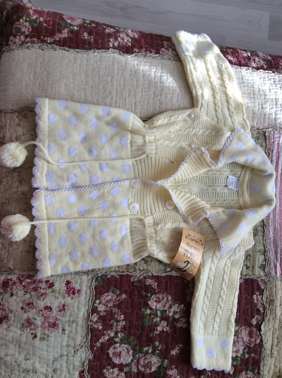 Для девочки тёплую кофту нежно жёлтого цвета, красивую на пуговицах, на поясе утяжка. Замечательно будет по весне как накидку или в летние вечера. Рост подойдёт на 86, хотя написано 2 года, но мне кажется меньше.
