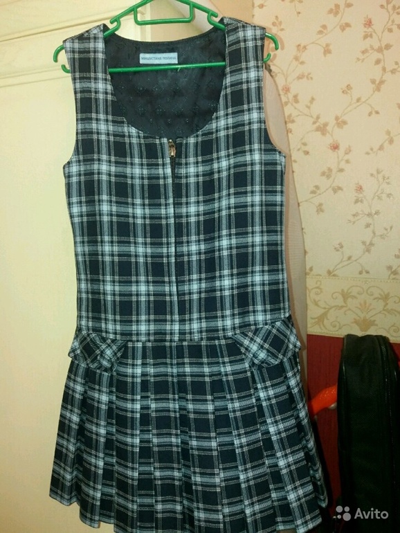 Всё для ШКОЛЫ.Цвет темно-синий с голубым. Состояние хорошее. Цвет выгодный, не маркий. Стирается в машинке. С накладными карманами и молнией спереди. Ну худых девочек.