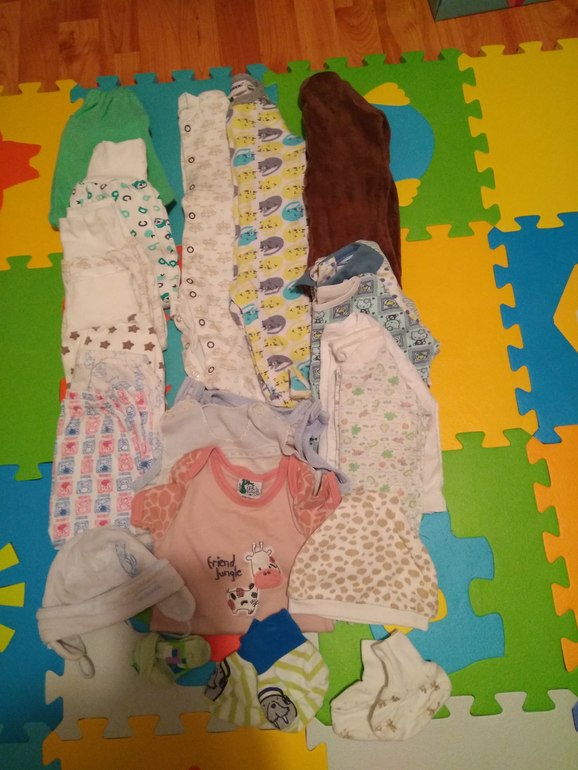 Ползунки (одни с начёсом и несколько обычных), бодики, три слипа, несколько распашонок, две шапки, носки и пинетки