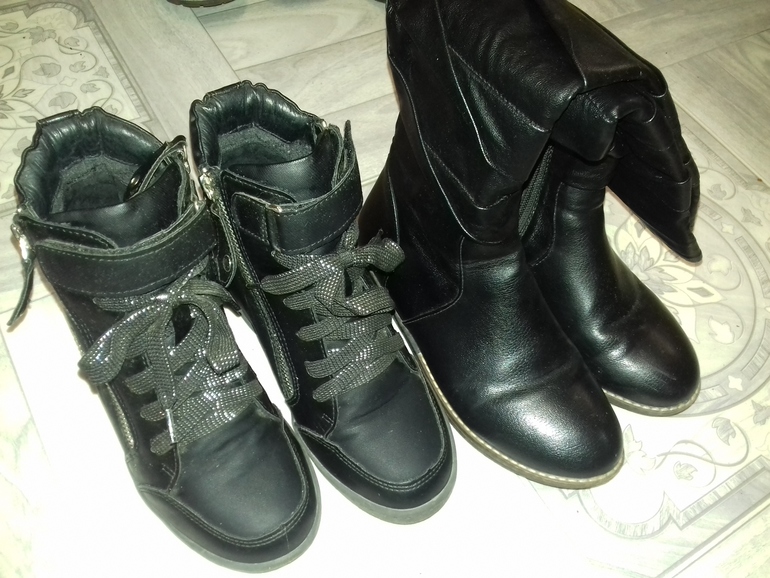 Имеются потёртости на мысах, у кроссовок немного подклеить надо, на высоком черном сапоге несквозной порез около молнии