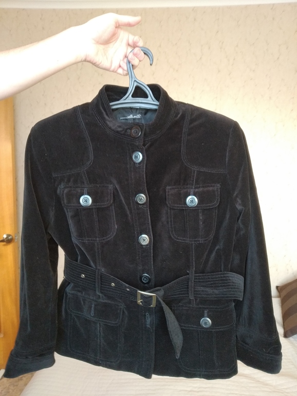 Пиджак (размер L) - велюр (не знаю, как правильно, как бархат), черного цвета.